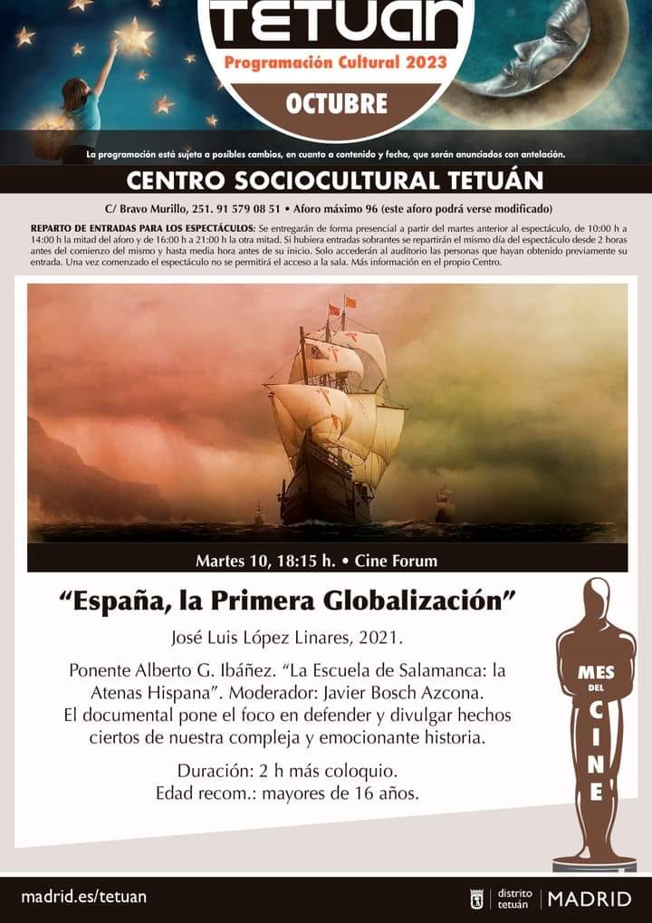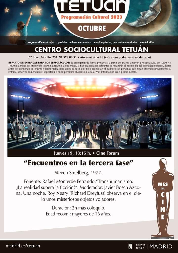 Cabe citar, como última acción, que de Octubre del 2023 a Diciembre del 2024, con el Ayuntamiento de Distrito de Tetuán (Ayuntamiento de Madrid) programamos, moderamos y presentamos el ciclo CINE Y PENSAMIENTO con las siguientes sesiones y conferencias: